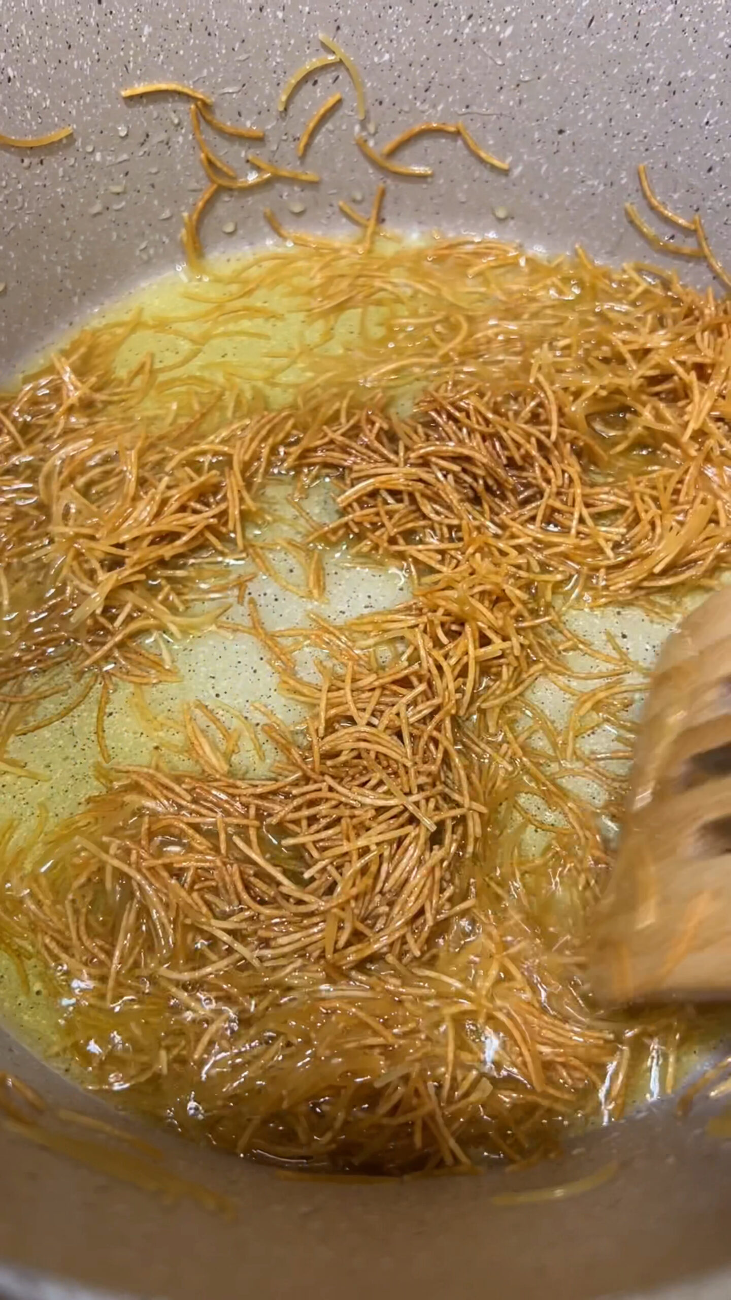 - In a medium pot, heat olive oil and fry the vermicelli noodles until they reach a deep golden caramel color.