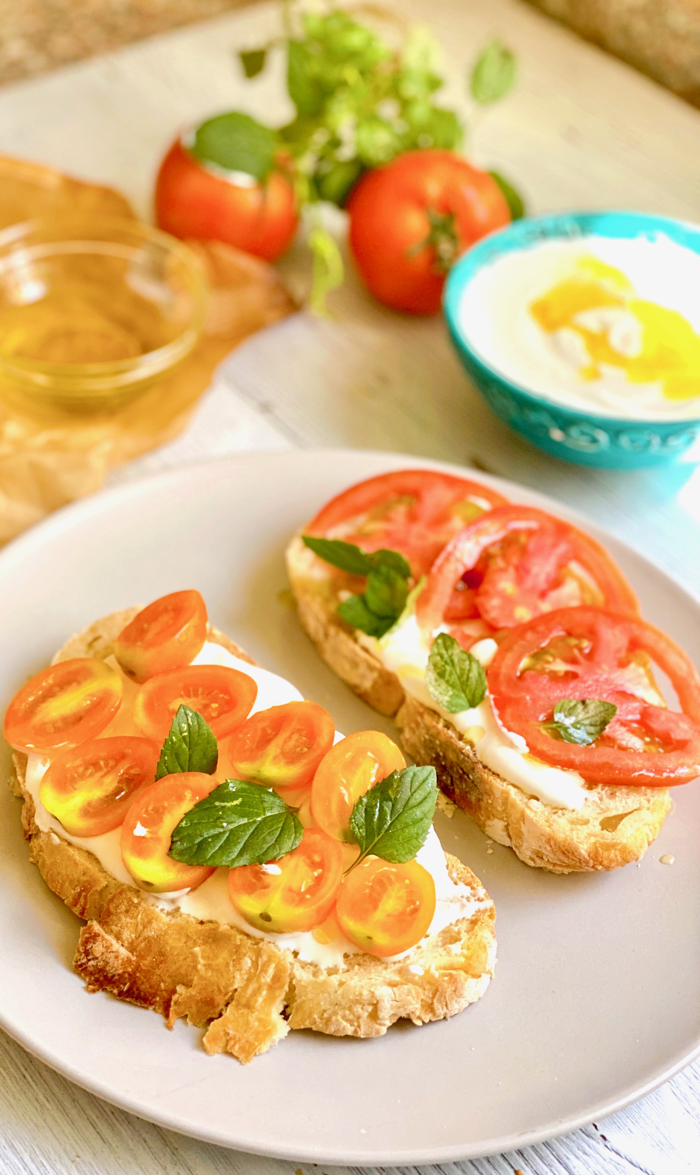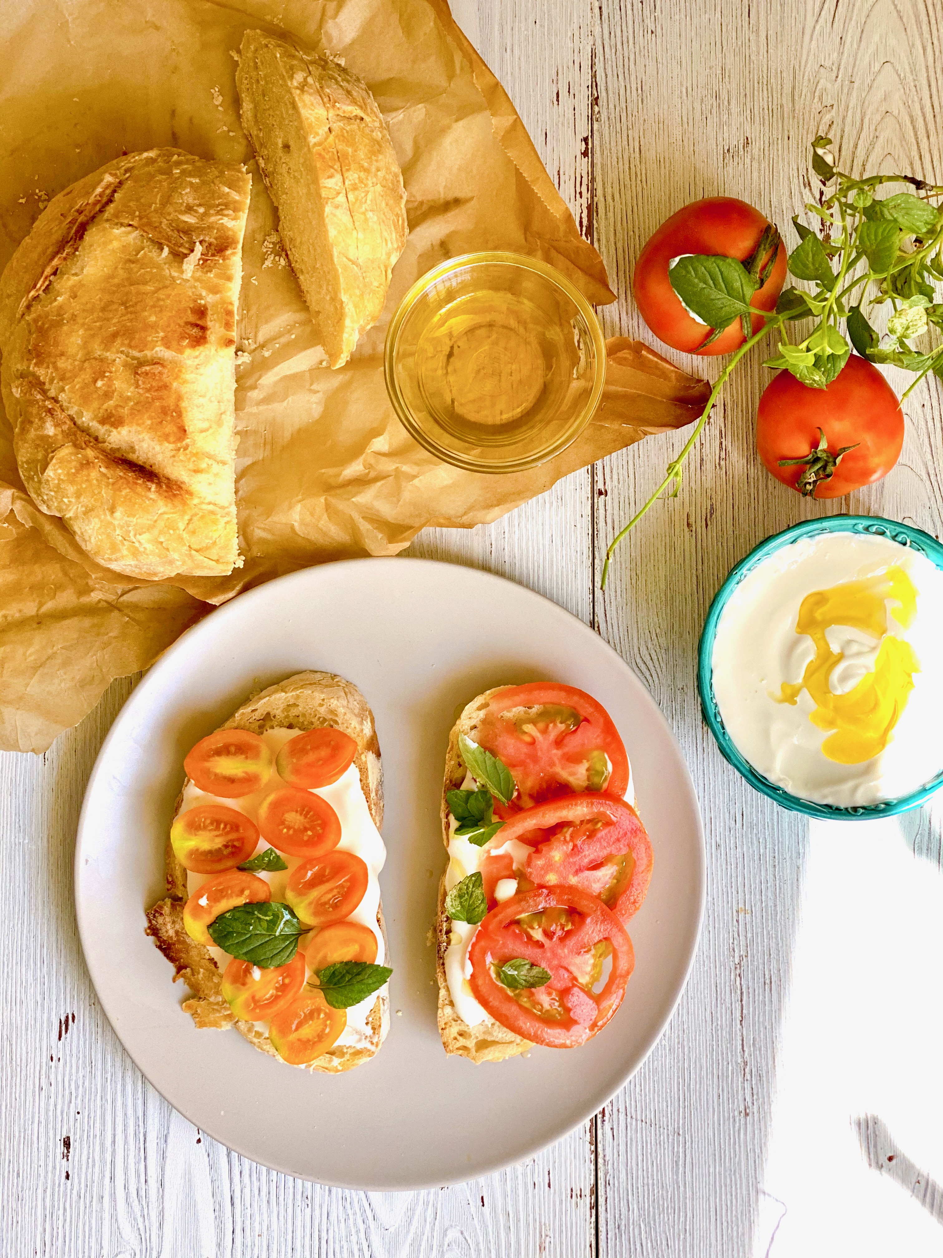 But I haven’t made those ideal world dreams a reality … yet. So my alternative is to avoid turning on my stove and oven at all costs. Enter Whipped Feta Tomato Toasts. If you use a thick crusty bread, Whipped Feta Tomato Toasts are super filling. All the key elements are there– Bread, Cheese, Tomatoes — what more could you ask for?!?!?!